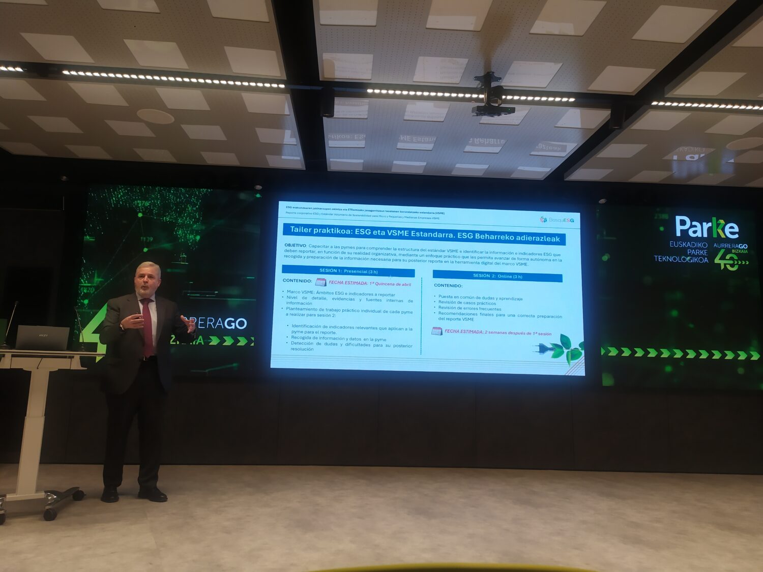 El pasado 12 de febrero, AFV/FEAF asistimos en el Parque Tecnológico de Zamudio a la jornada «Reporte corporativo ESG y Estándar Voluntario de Sostenibilidad para Micros y Pequeñas y Medianas Empresas – VSME», en la cual se presentó la iniciativa BasquESG, impulsada por el Departamento de Industria, Transición Energética y Sostenibilidad del Gobierno Vasco.